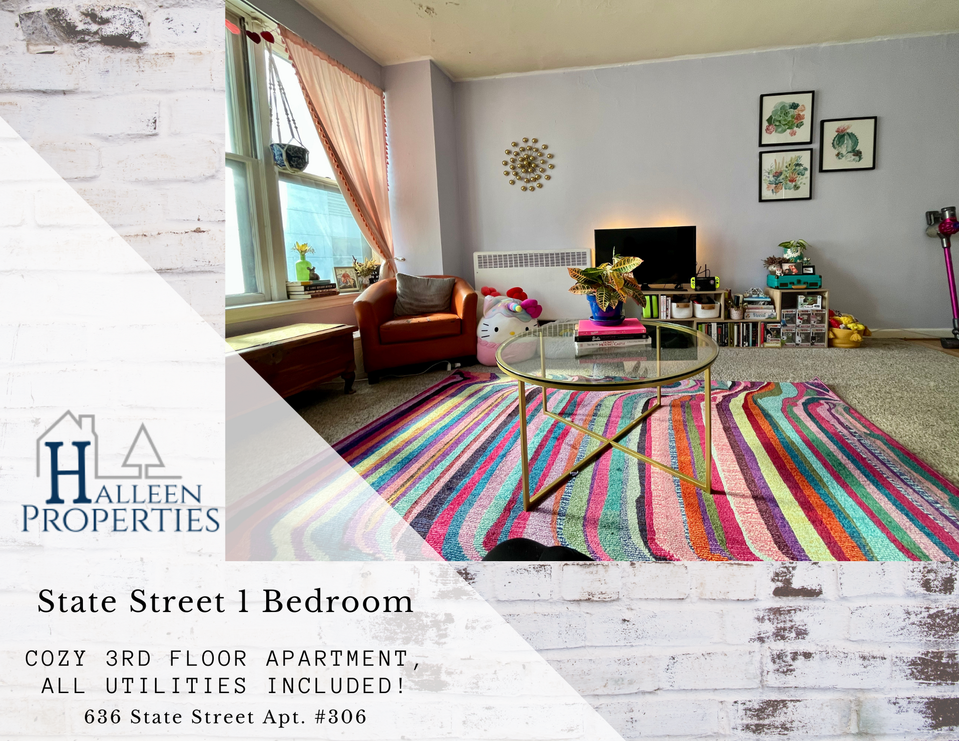 Our 3 Bedroom #303 is sweet. There's lot of natural light in the main room that overlooks State Street and faces south. Great for plants, great for energy, and the light brightens your day! This apartment has recently gone through a makeover. We renovated the hardwood floor, installed a brand new stove, painted a lot of the interior including the kitchen cabinets, replaced nearly all of the carpet, installed a BRAND NEW HVAC which cools the space, and updated our light fixtures.